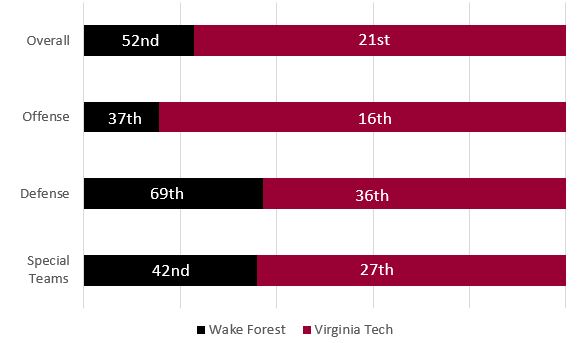 Wake Forest reminds me of NC State. They are competent on both sides of the ball, but aren’t really great at any one thing. Their most impressive stat is being ranked 2nd in the nation averaging a +2 turnover margin per game. They’ve only turned the ball over once all year. That’ll keep you a lot of games. The scariest aspect of their offense is that they are VERY well balanced. If the Hokies can’t stop the run, they might run into a situation like the UNC game where Wake could pour on the points. I’m hopeful the run defense has improved since that game, but will the Hokies be able to stop Wake’s potent passing attack?