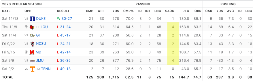 Virginia’s offense is driven by true freshman QB Anthony Colandrea. He has gone over 300 yards passing and over 60 yards rushing each of the last two games. He has been UVA’s leading rusher in both those games. He also has a great receiving option in WR Malik Washington. Washington is one of the best wide receivers the Hokies will face this season. He is already over 1,300 yards receiving with 9 touchdowns. The key to stopping the ‘Hoos offense will be to stop Colandrea. Keep him bottled up in the run game and get pressure on him. He has been sacked 15 times in his last six games. Virginia is 116th in the FBS in sacks allowed. This would be a good week for APR to get back in on the sack party.